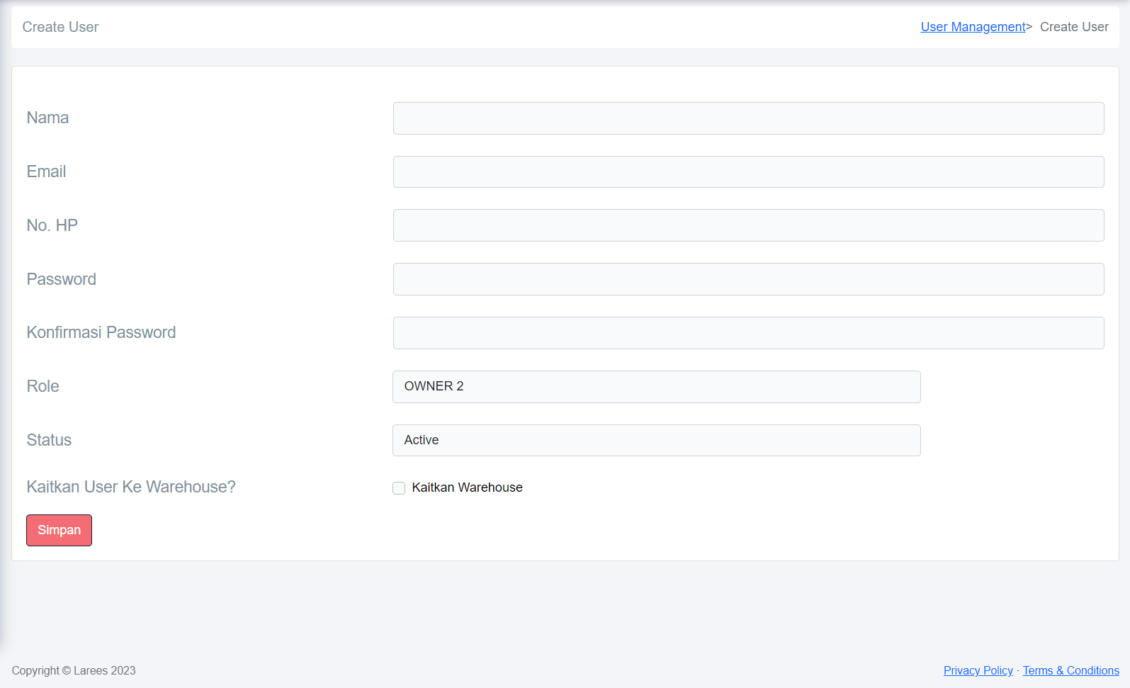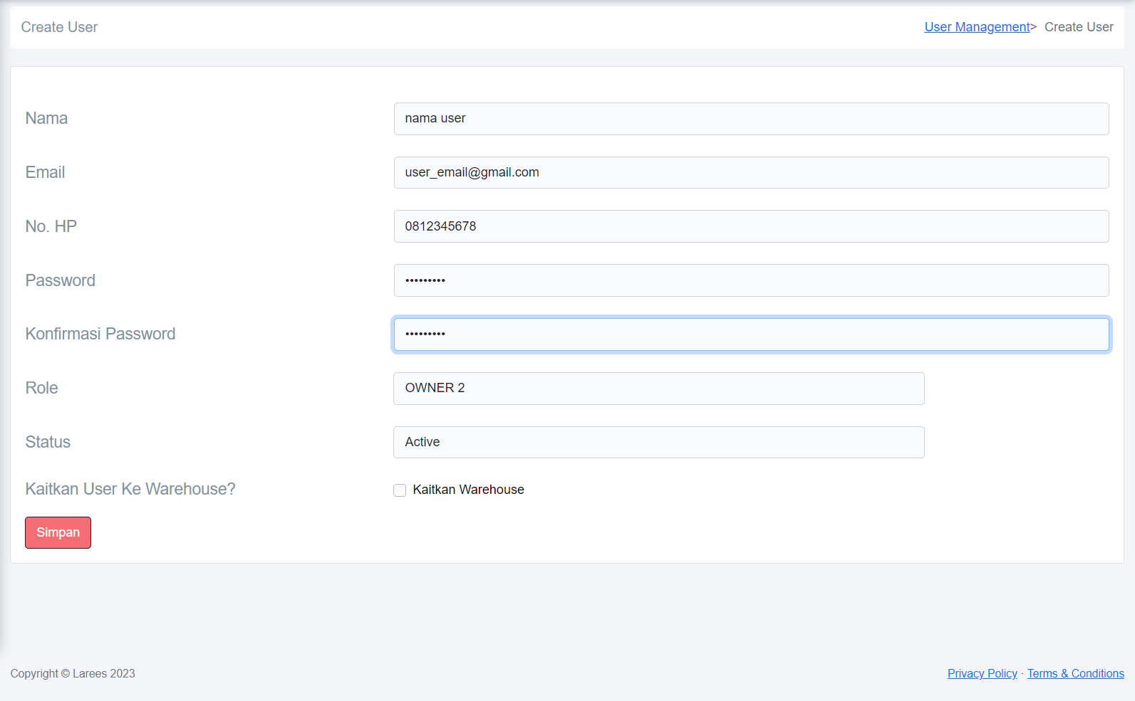Pada label kaitkan user ke Warehouse anda bisa kaitkan user yang sedang anda buat untuk terkait pada warehouse yang anda tentukan