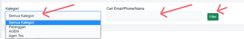 Anda bisa mencari Customer berdasarkan Kategori atau berdasarkan Nama/No Hp/Email, jika sudah anda bisa klik tombol Filter